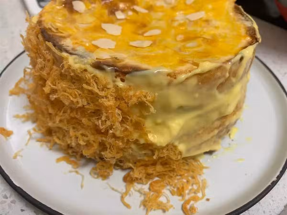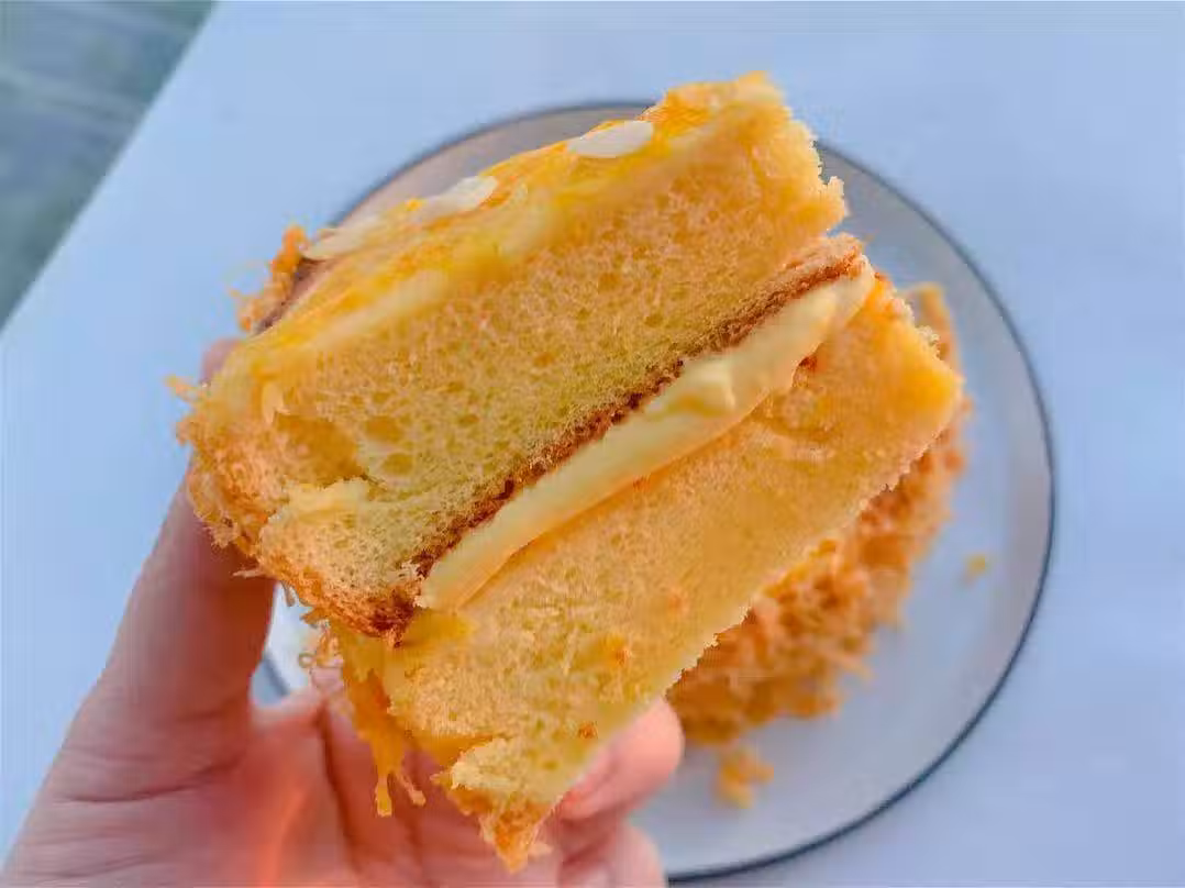 9、另一塊蛋糕抹上卡士達醬,蓋上另一塊蛋糕片,周邊抹上卡士達醬,沾上肉鬆就做好啦!