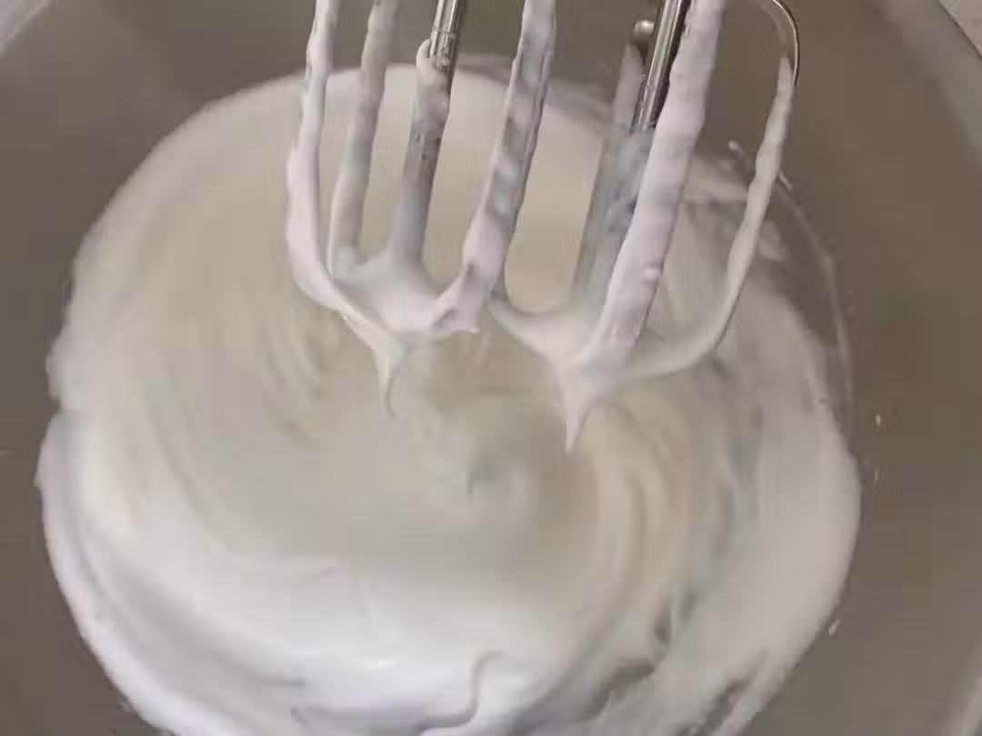 3、加入蛋清,檸檬汁,分3次加入細砂糖打發,提起打蛋器有小尖角。
