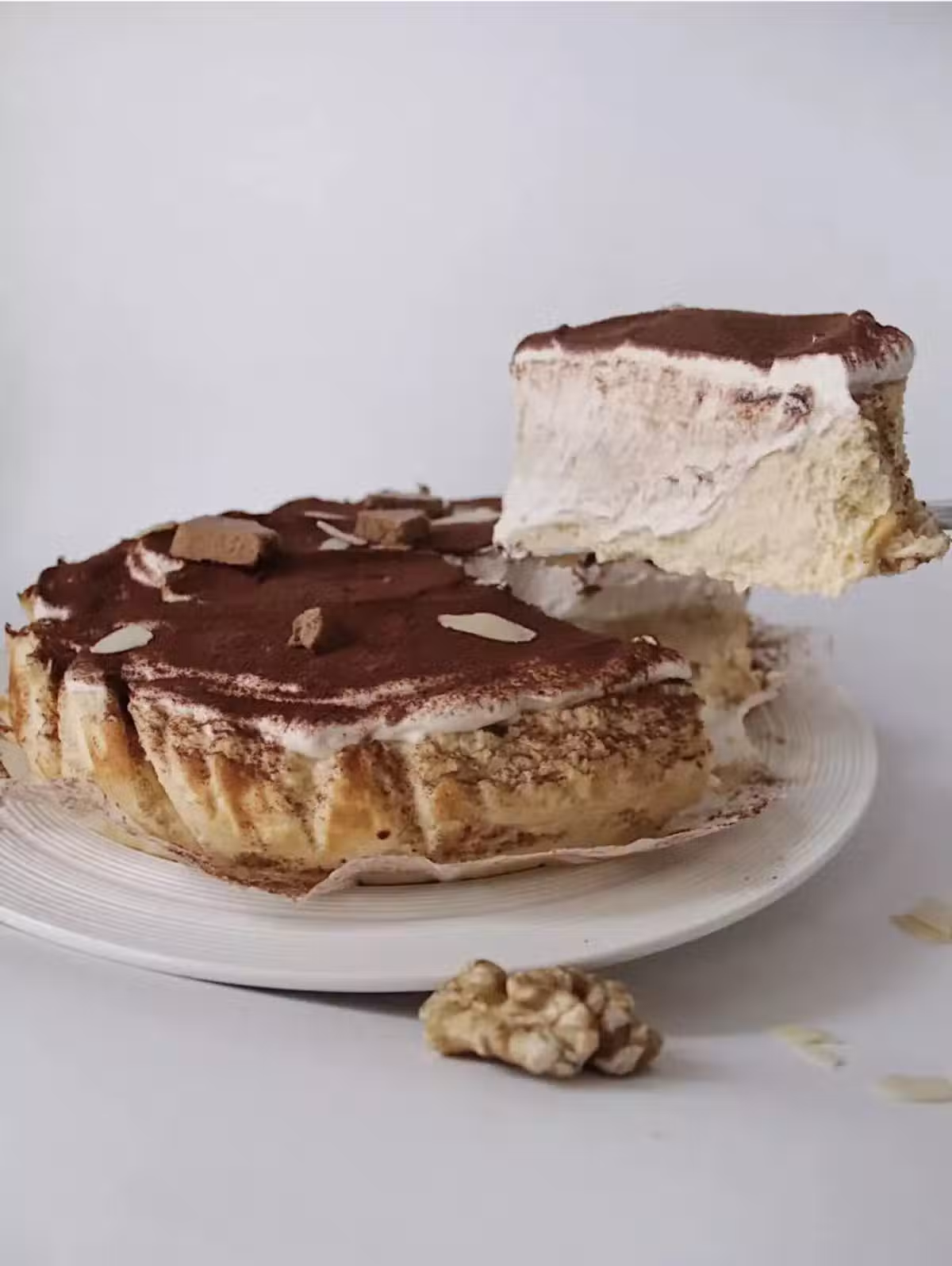 食材:(巴斯克底)奶油奶酪200g/淡奶油200g/雞蛋2個/代糖35g/香草精適量/(提拉米蘇頂)馬斯卡彭90g/淡奶油80g/代糖18(依口味定)/可可粉適量