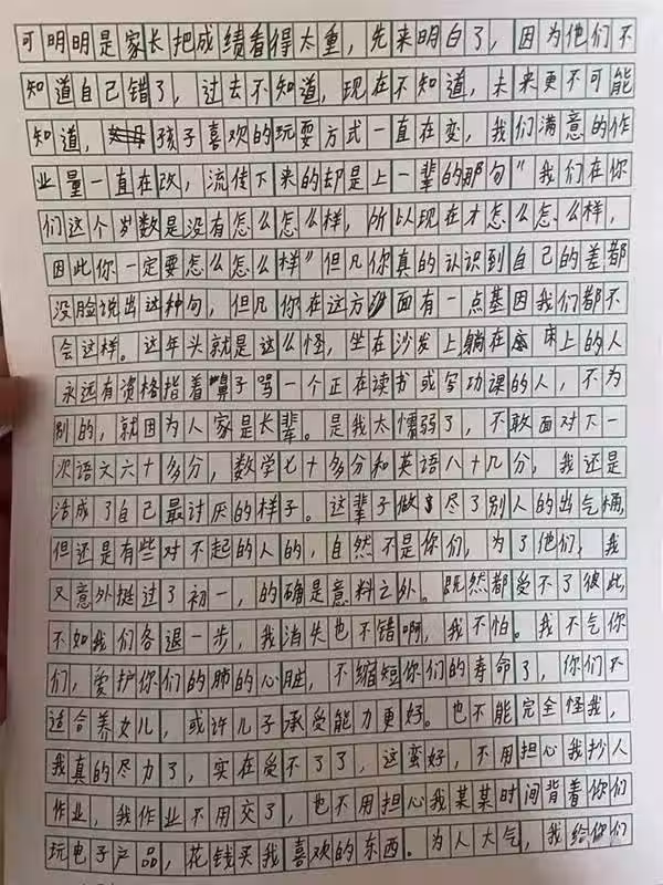 人生一趟, 遇見你們我很榮幸, 若有來生, 我們不要再見面了, 想想也沒什麼, 你們愛的不是我, 是沖進班級前十的我, 是排名年級前二十的我, 是考到滿分的我, 你們心目中的完美女兒太優秀, 我達不到。 開學就是初二了,
