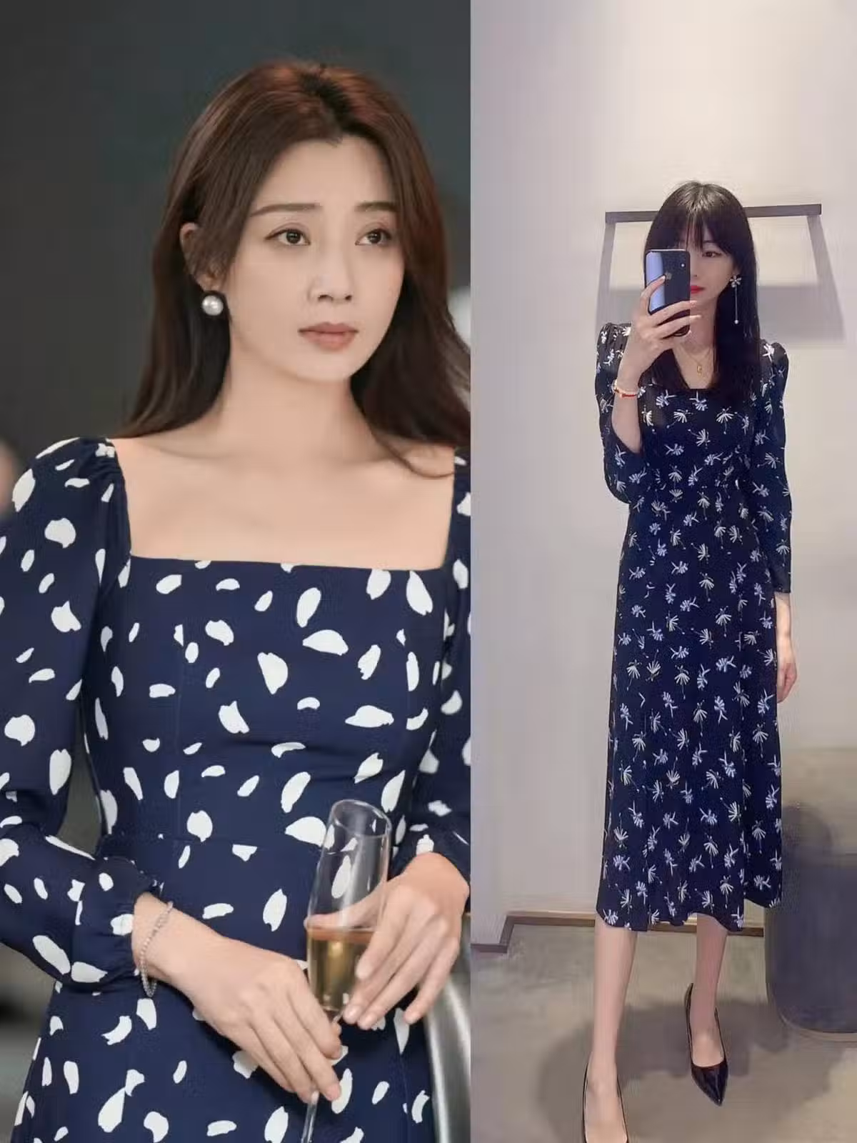 但若是喜歡更加優雅得體一些的造型,那不妨嘗試一下 方領設計的上衣或者連衣裙 ,像殷桃所選的這件方領印花裙。通過方領的設計,加大了頸部的露膚度,在弱化大骨架的同時還能增添復古氣息,更能演繹出帶有法式風格的穿搭。
