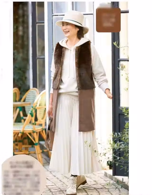 春季的氣候逐漸變暖,半身裙是一款很好的搭配款式,它既能夠很好地修飾中年女性的身材,同時又十分符合中年女性對優雅穩重穿衣風格的追求。這組白色衛衣+白色百褶裙的搭配明亮端莊,其中白色衛衣款式寬鬆,百搭舒適,下半身搭配的這款白色百褶裙在配色上與上衣保持了一致。外面搭配這款棕色無袖外套,更顯溫柔隨和之美。
