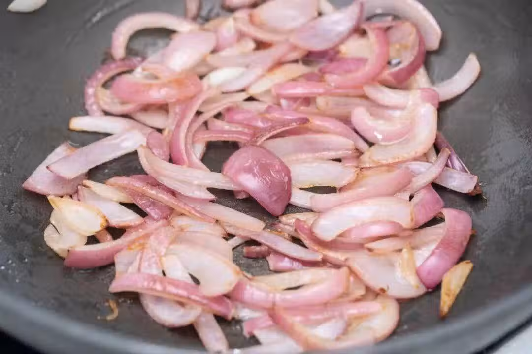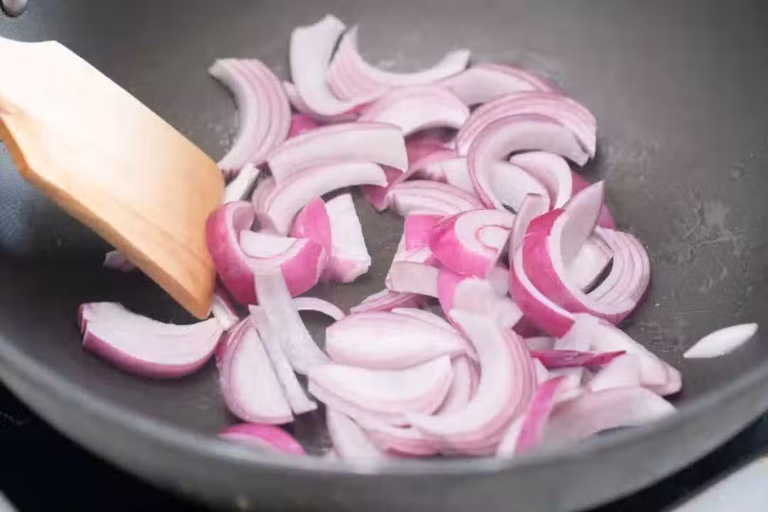 2、小火翻炒至洋蔥香軟微焦後離火待用。