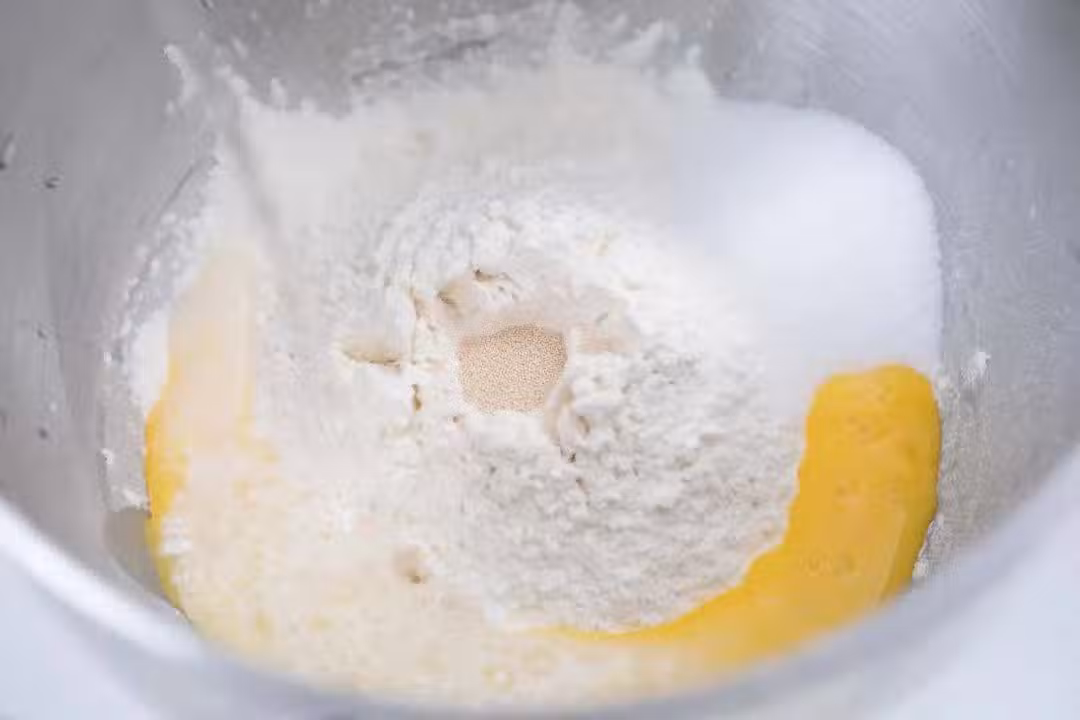 3、攪麵缸里放入主面團所有材料,除了黃油。如果是夏天,可以使用冰水,能保持面團溫度不超過28℃,因為面團溫度過高,會影響出膜效果,並導致提前發酵。如果是冬天,可以使用溫水,能適當激活酵母,避免發酵時間過長。