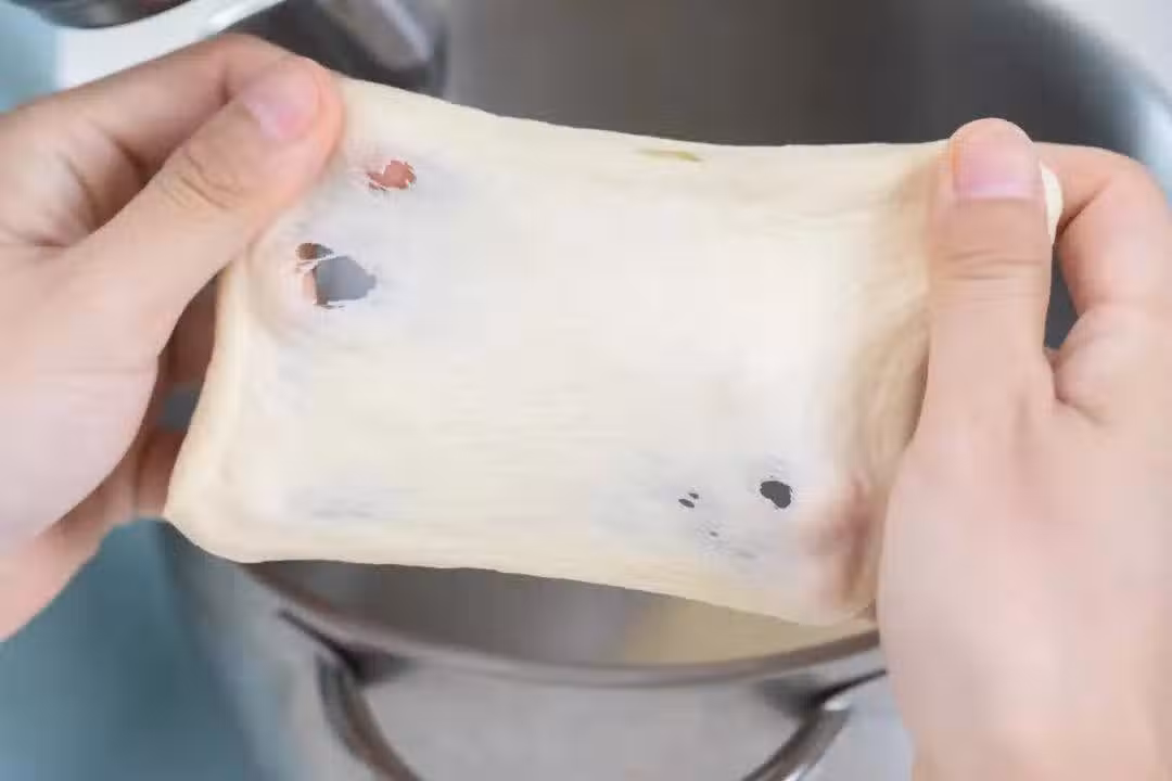 4、先將面團攪拌至可撐開粗糙薄膜。