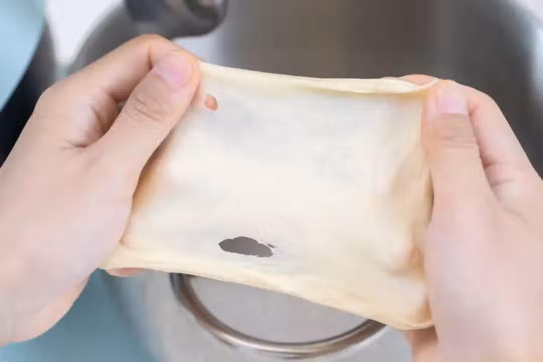 6、直到面團可以撐開大片薄膜。由於調理麵包不需要達到吐司的出膜程度,所以沒必要揉到非常薄的透明薄膜。