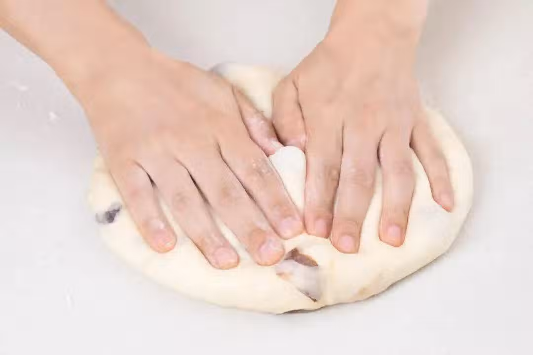 10、桌面撒少許高粉防粘,取出面團雙掌按壓排氣。