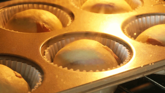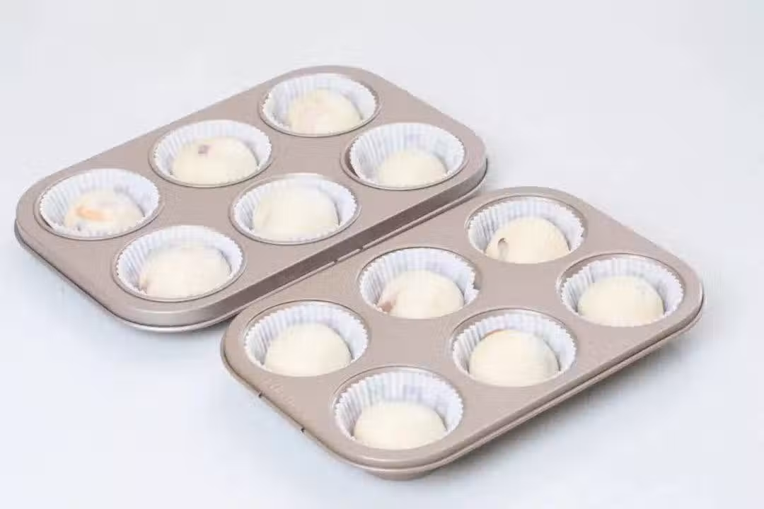 16、在金屬連模中放入軟紙杯,把面團放入紙杯中。