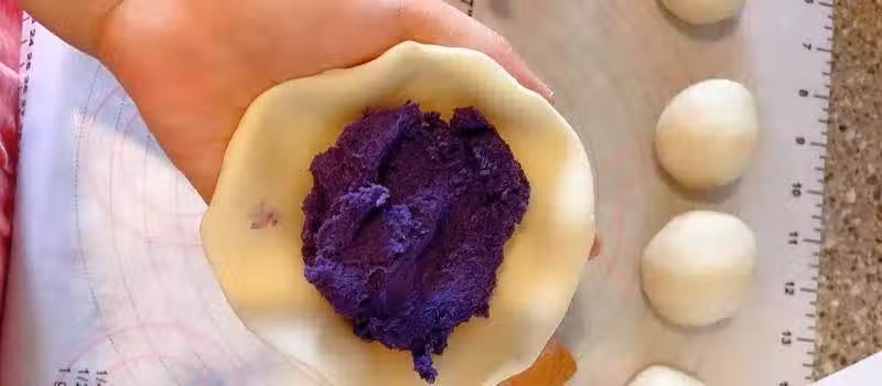 6、放一大勺紫薯餡料進去。紫薯餡料非常好包。稍微一推就成團了