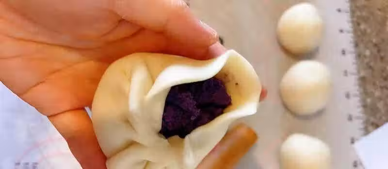 紫薯餡兒不能太稀…牛奶不能加太多。如果不小心稀了就無油平底鍋翻炒一會。燙面是100攝氏度的沸水直接倒進面里。