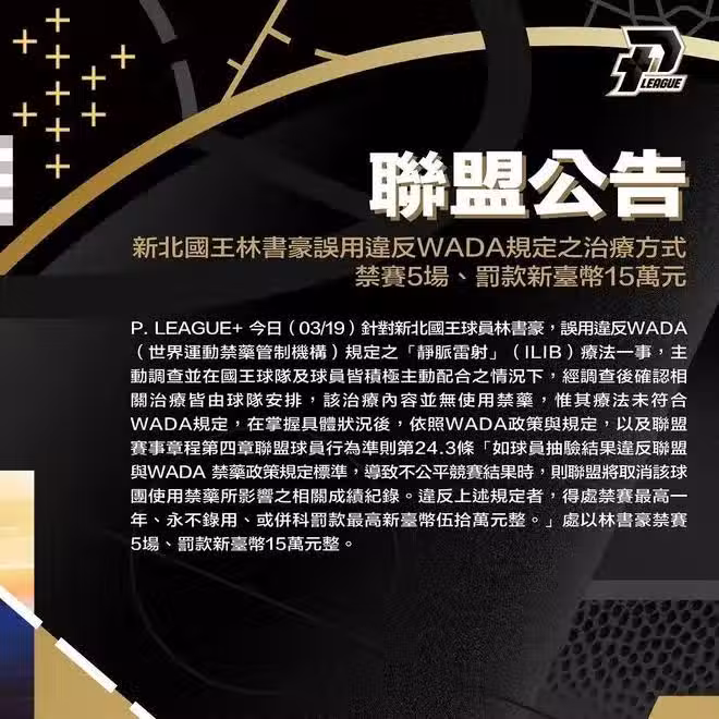 3月19日晚,P+聯賽(P. LEAGUE+)官方發布聲明,對林書豪禁賽5場+罰款15萬!林書豪所在的新北國王隊正式道歉:「全力配合聯盟的藥檢和調查,尊重與接受聯盟的處罰決定。對球員誤用療法,慎重反省並道歉。」