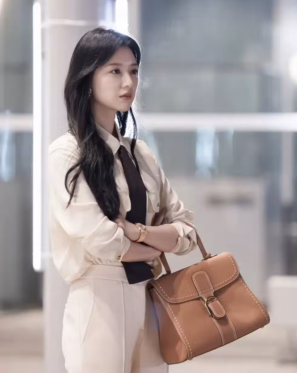 女王自然又有包包來為造型增加亮點,來自比利時的Delvaux、又有貴婦包之稱,其經典包Brillant深得金智媛喜愛,在《淚之女王》第2集,金智媛穿著米黃色系套裝搭配 Delvaux Brillant MM Surpiqué茶色手袋,展現作為女王集團CEO的幹練俐落。