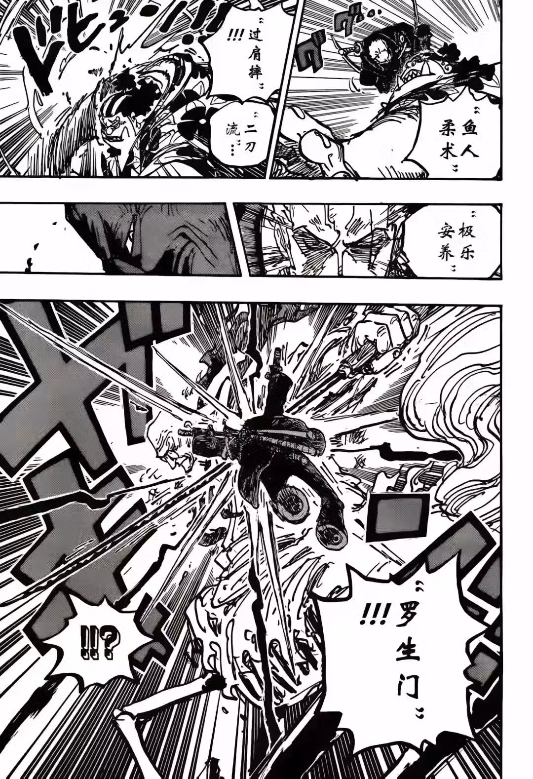 馬骨和索隆都認出了對方的鬼徹,他們的戰鬥產生了黑色閃電,強大的衝擊波把雙方都彈開了。甚平接住了索隆,索隆讓娜美等人先離開,等下自己和甚平再跑回去,在未來島東岸,巨人族正在跟海軍開戰,他們擊沉了不少海軍軍艦。