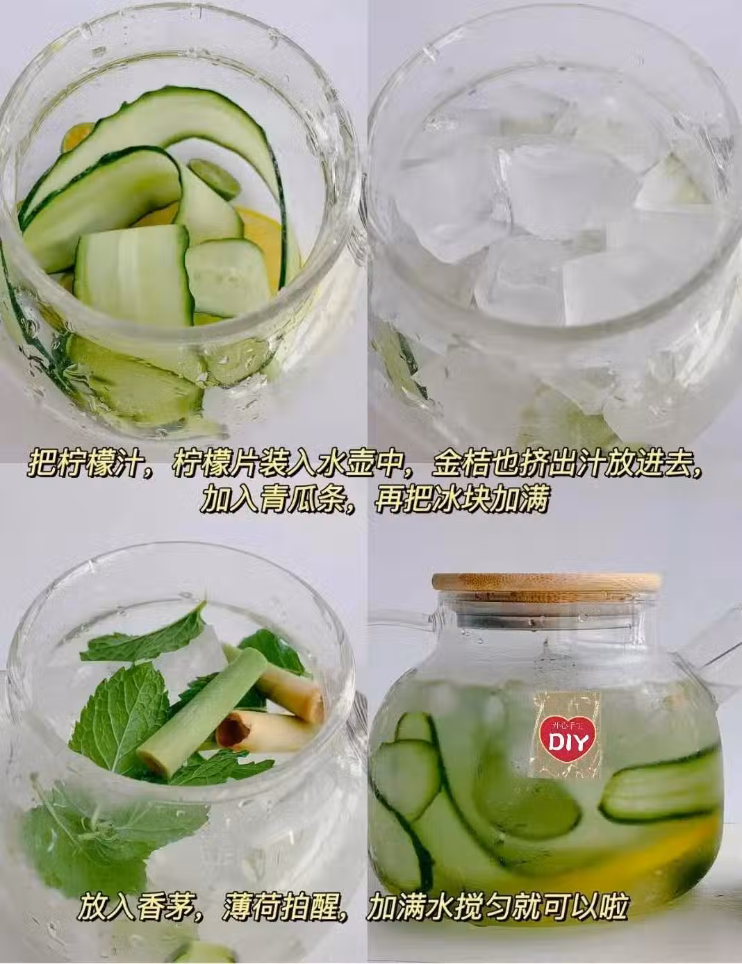 檸檬、青瓜、金桔、薄荷、香茅、冰塊🧊、冰水