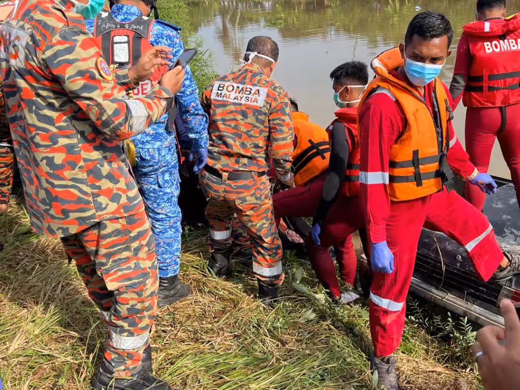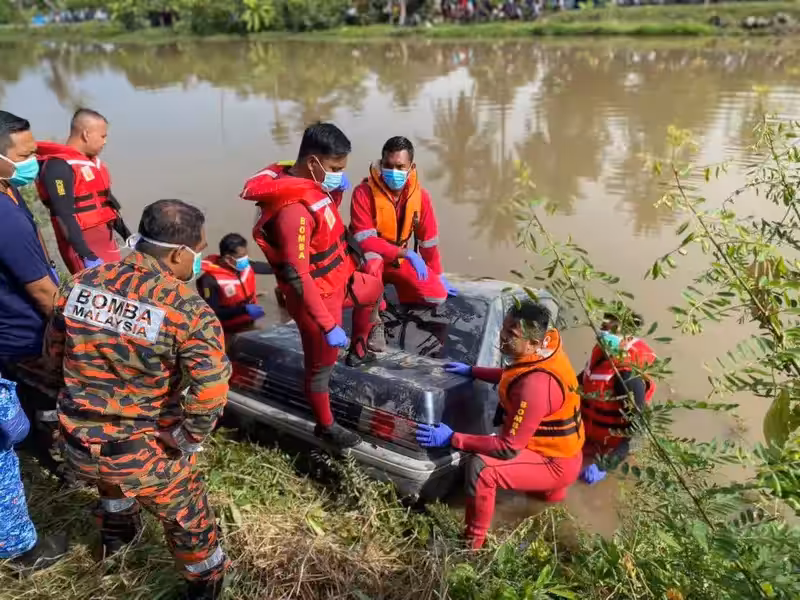 據了解,這輛寶騰Iswara車子今天早上8時30分被發現沉入雙溪古洛的灌溉運河,消拯局發文告證實一家六口死亡,身份確認為巫裔兩夫妻和4名孩子。