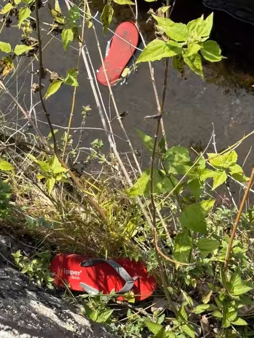 吳先生告訴本報,家人是是在油站後面找到何文輝的紅色拖鞋,並證實是女婿外出時穿的鞋子。(吳先生提供)