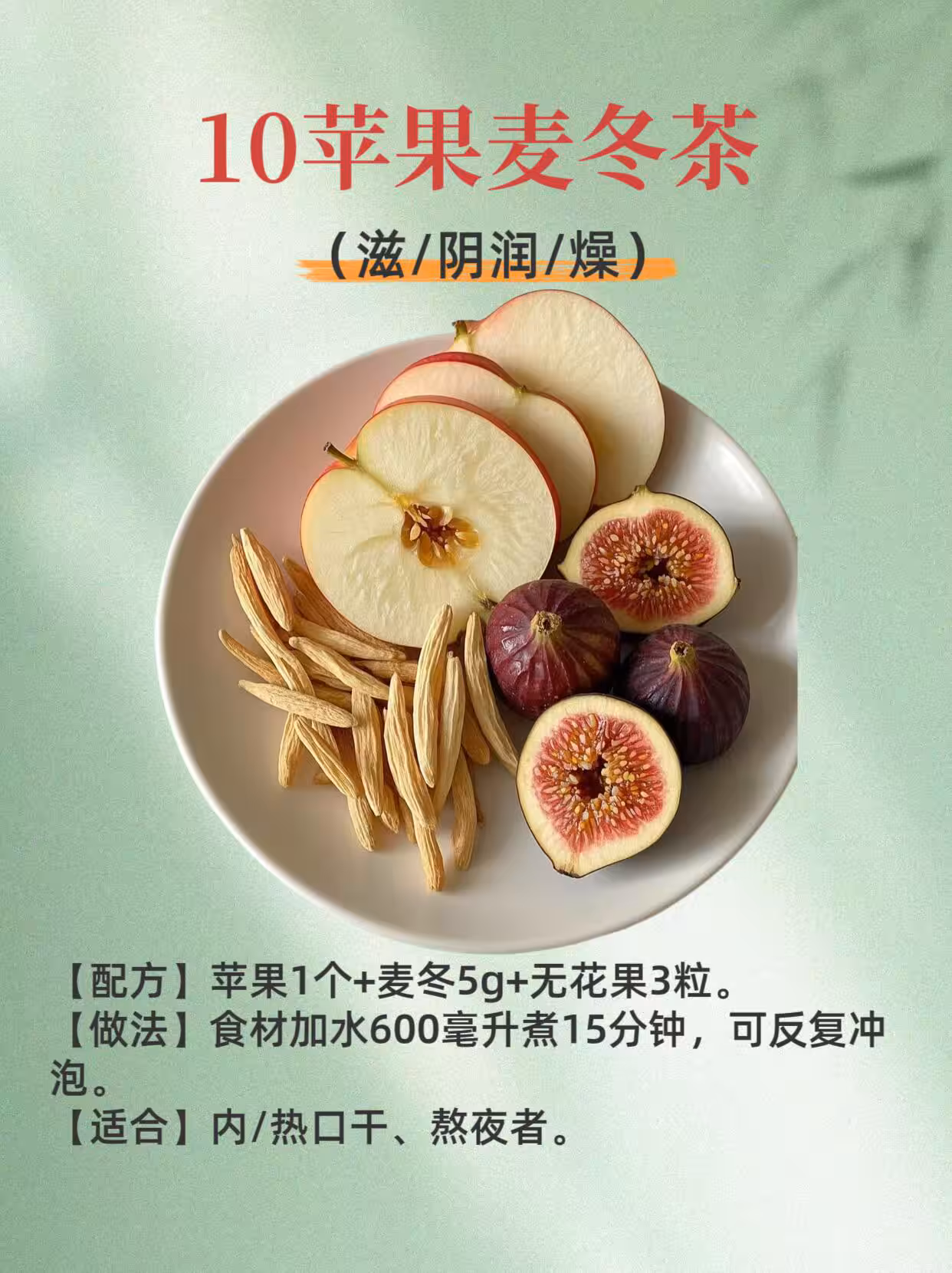 🌾 蘋果麥冬茶:蘋果1個+麥冬5g+無花果3粒。所有食材煮15分鐘,可反覆沖泡。