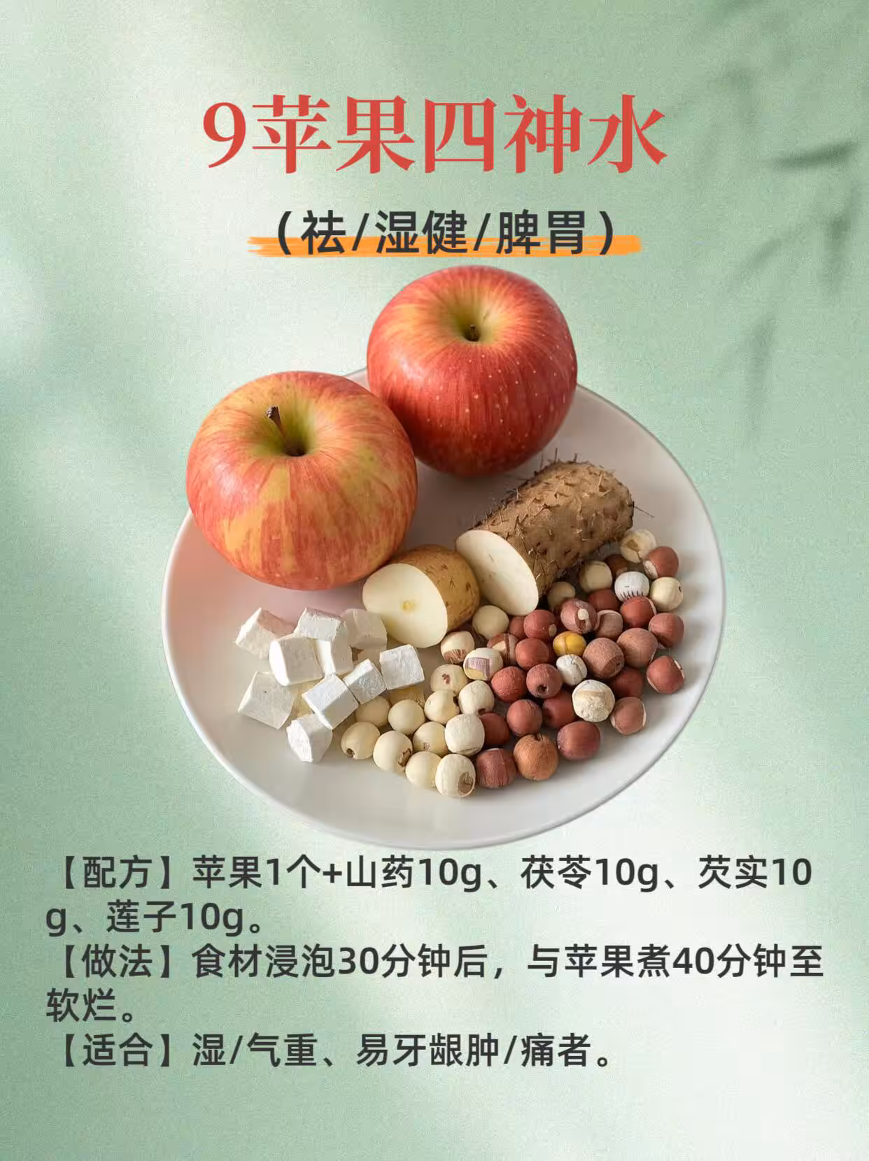 🌰 蘋果四神水:蘋果1個+山藥10g+茯苓10g+芡實10g+蓮子10g。食材浸泡30分鐘後,與蘋果煮40分鐘。