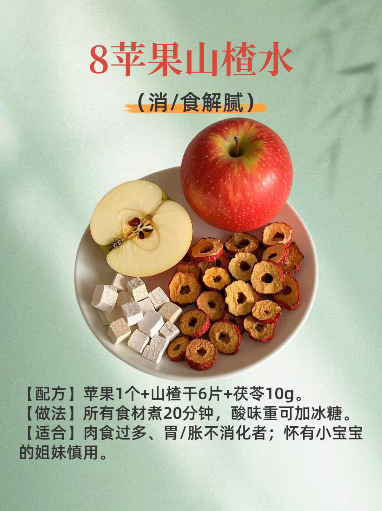 🍋 蘋果山楂水:蘋果1個+山楂干6片+茯苓10g。所有食材煮20分鐘,加冰糖調味。