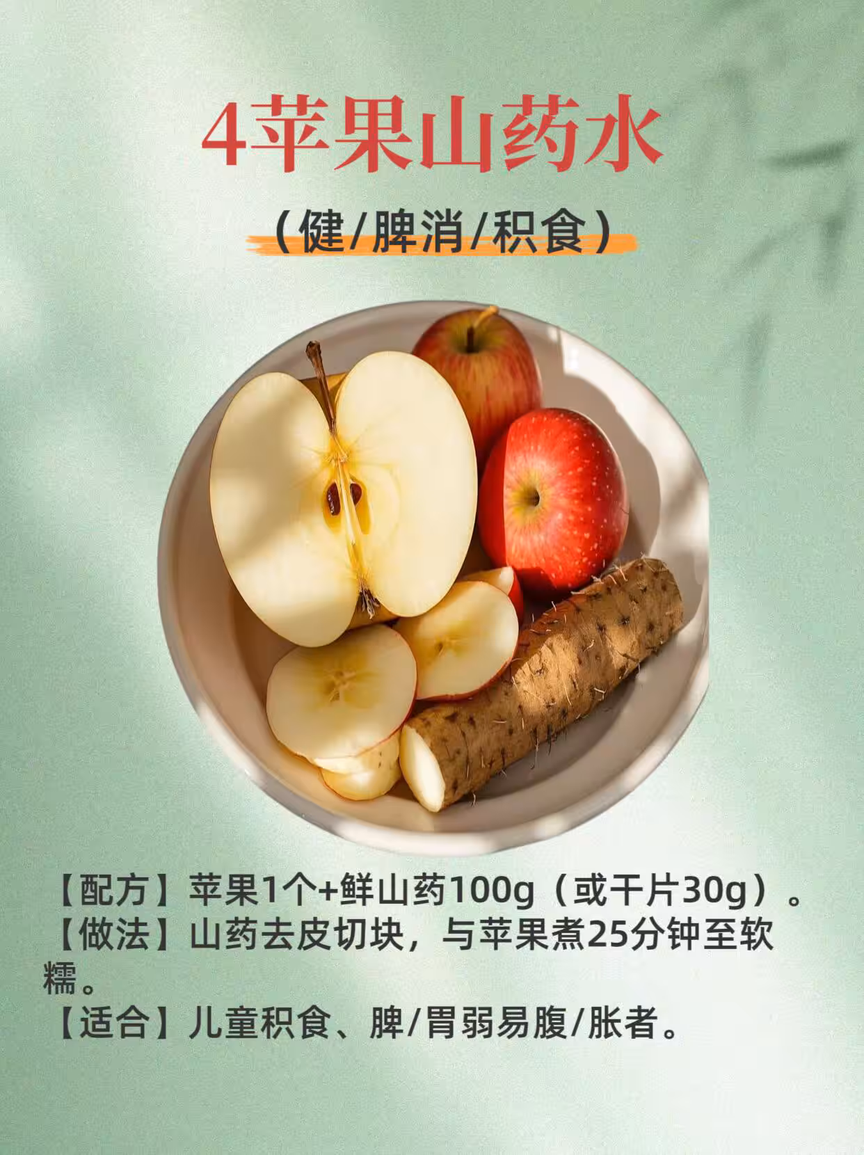 🌿 蘋果山藥水:蘋果1個+鮮山藥100g。所有食材煮25分鐘至軟糯。