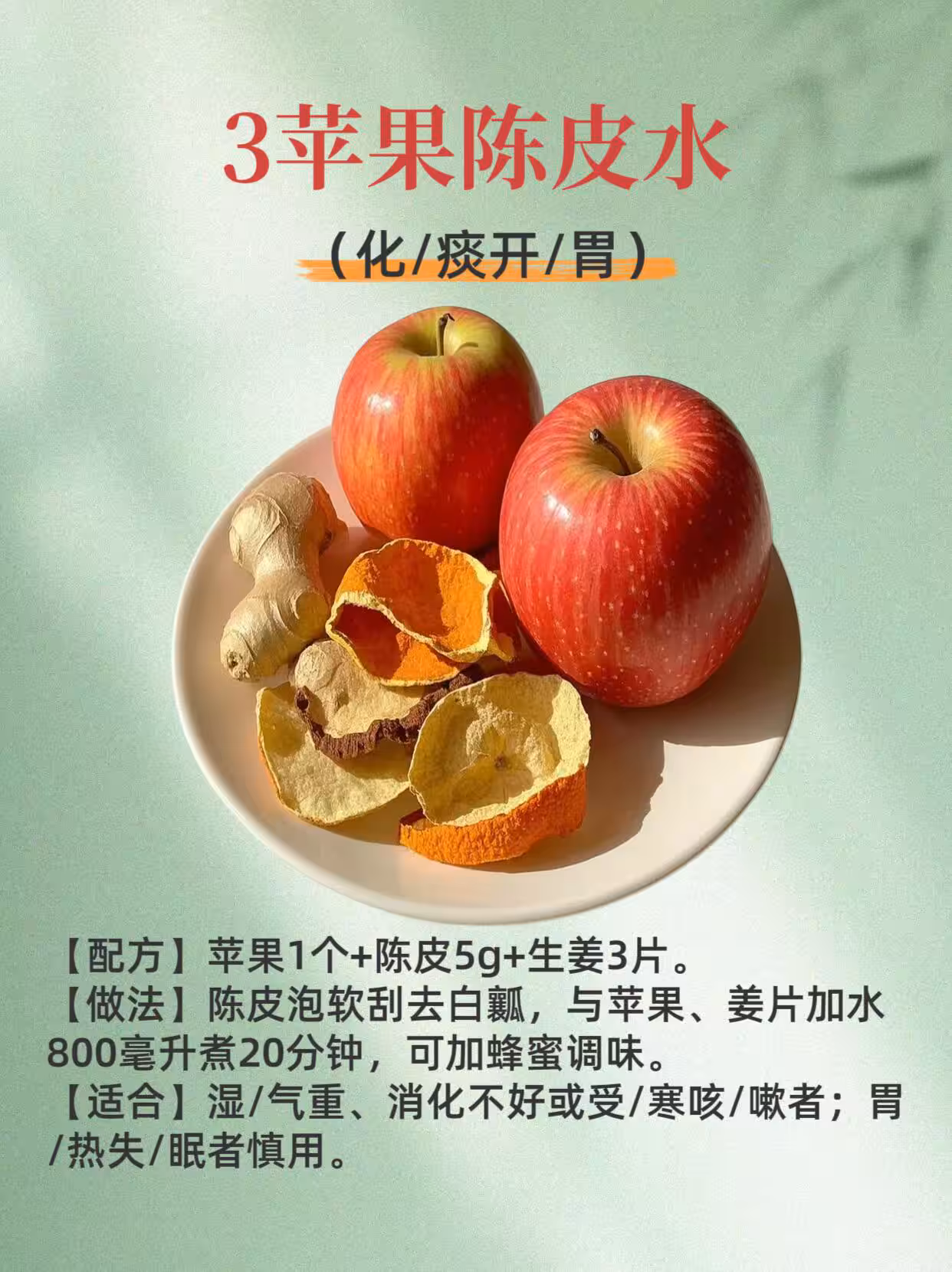 🧡 蘋果陳皮水:蘋果1個+陳皮5g+生薑3片。陳皮泡軟去瓤,所有食材煮20分鐘,加蜂蜜更贊。