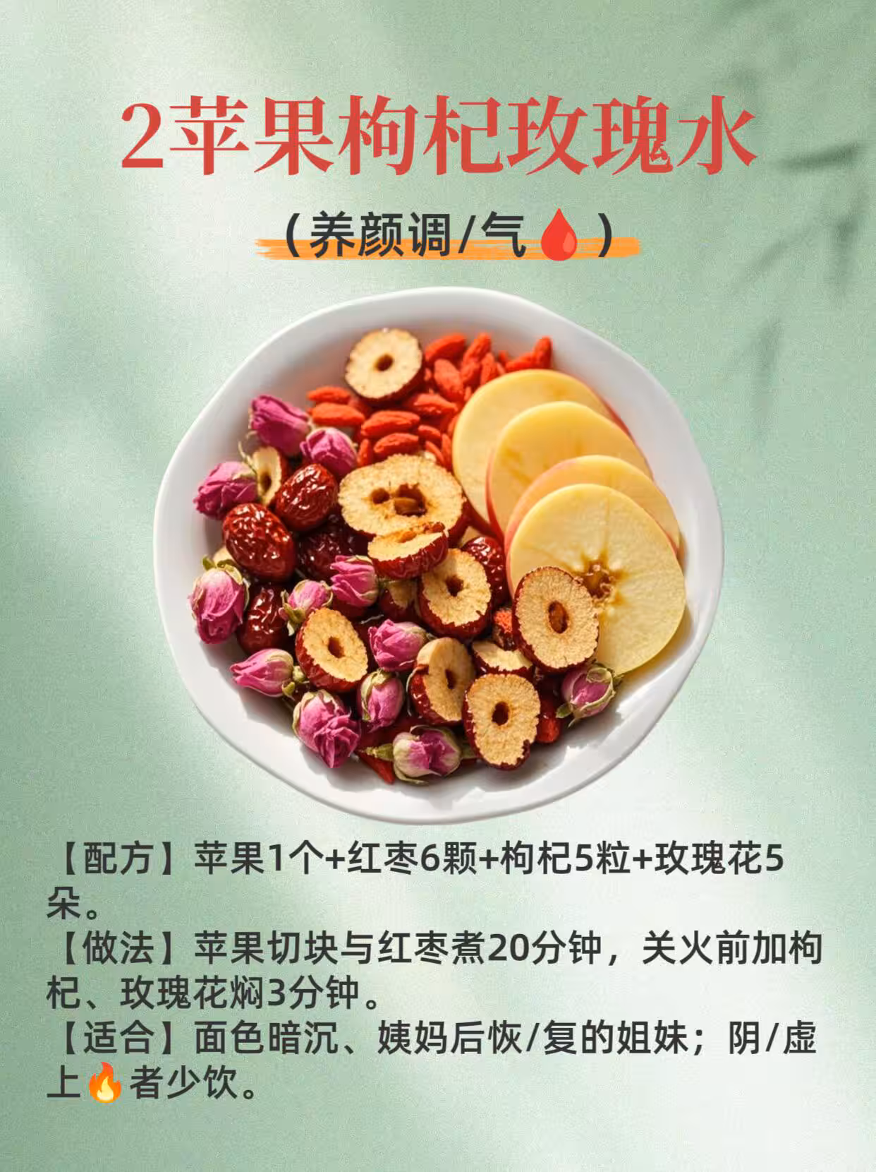 🌹 蘋果枸杞玫瑰水:蘋果1個+紅棗6顆+枸杞5粒+玫瑰花5朵。蘋果紅棗煮20分鐘,關火前加枸杞玫瑰燜3分鐘。