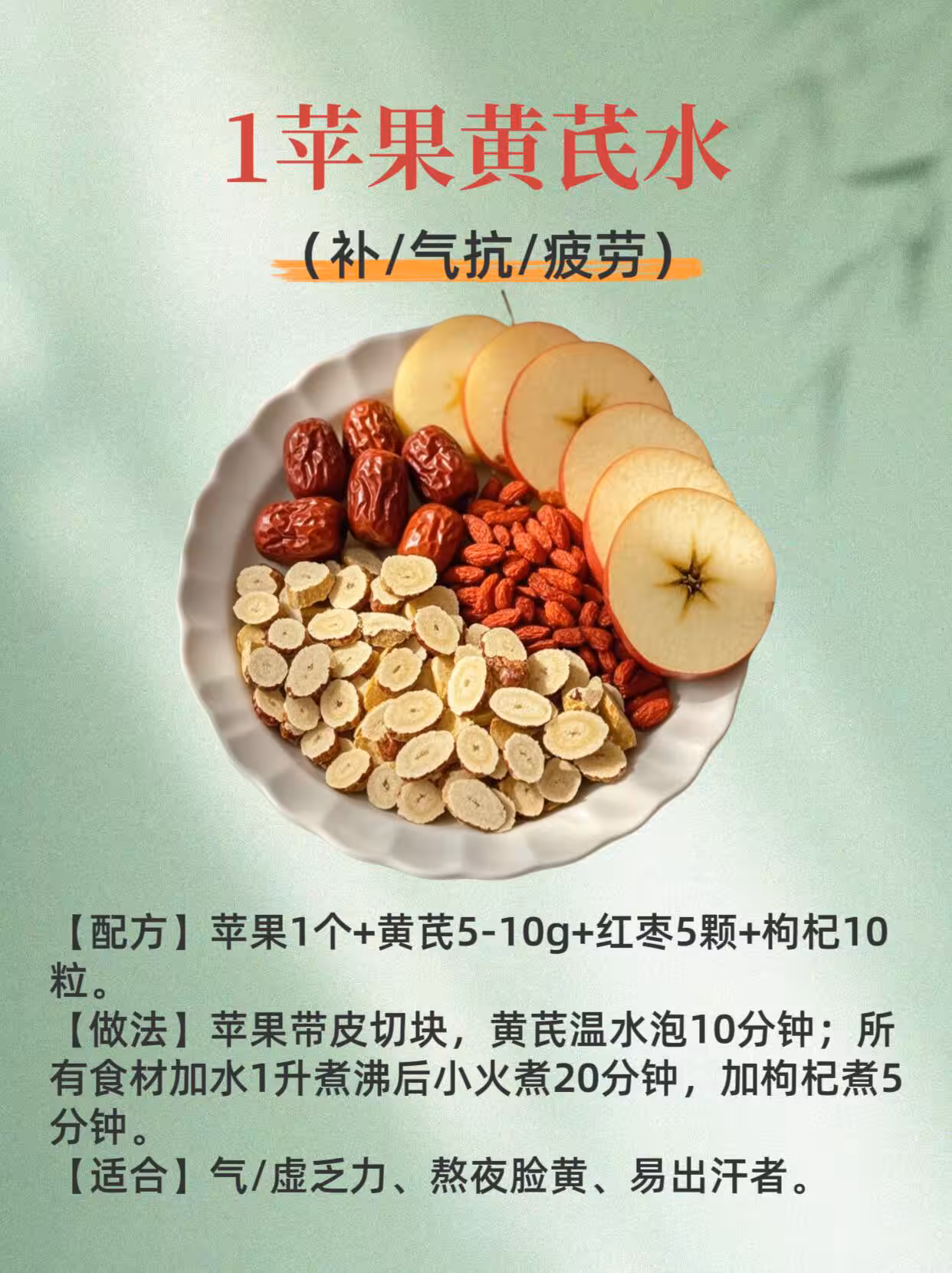 🍎 蘋果黃芪水:蘋果1個+黃芪5-10g+紅棗5顆+枸杞10粒。蘋果帶皮切塊,黃芪泡10分鐘,加水煮20分鐘後加枸杞燜5分鐘。