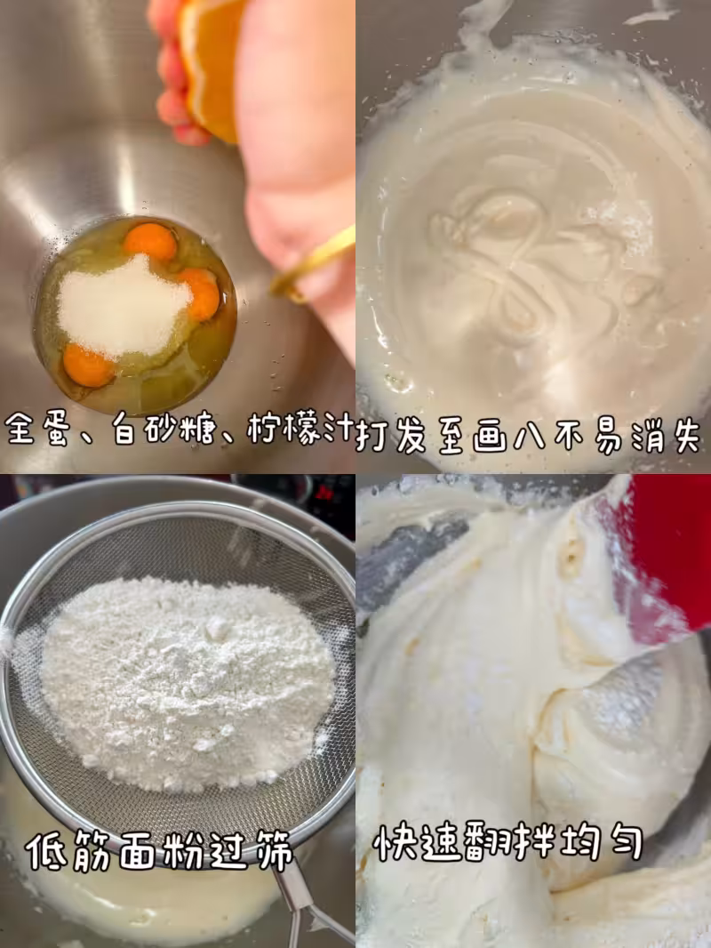 1⃣️3顆全蛋一次性加130g白砂糖幾滴檸檬汁放廚師機11檔打發4分鐘,打發至畫八字不易消失就可以