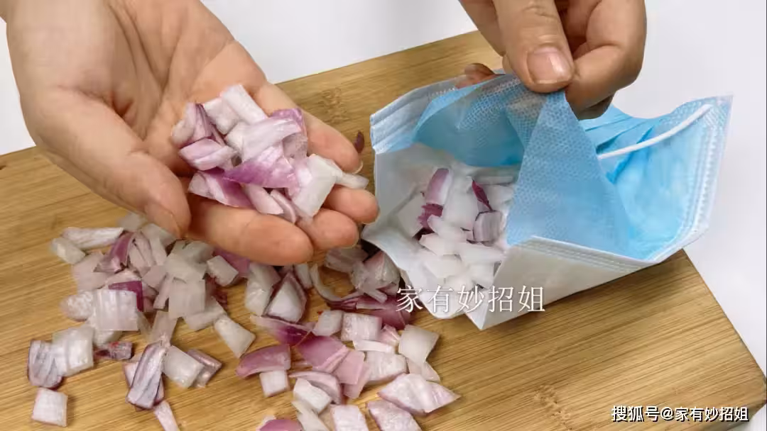 現在的生活工作壓力大,這就導致很多朋友都有失眠的困擾,有時候躺在床上,明明自己已經很累了,卻翻來覆去的怎麼都還睡不著。可晚上不睡白天就會沒精神,嚴重影響著第二天的正常生活。其實想要解決這個問題,利用上一個洋蔥就可以了,我們把洋蔥都切成小塊的,然後再拿個一次性的口罩,把口罩的一端剪開後,將切碎的洋蔥都塞到口罩裡面。