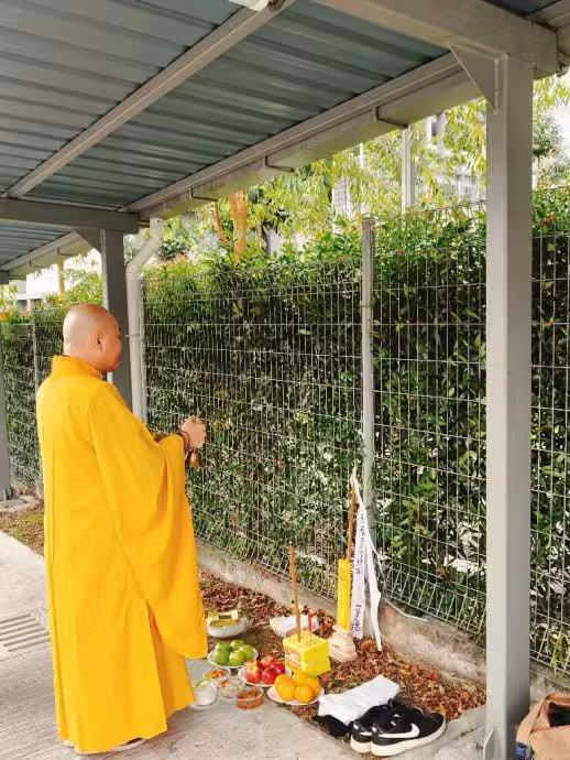 僧人在墜樓案現場為郭峻豪進行招魂儀式。