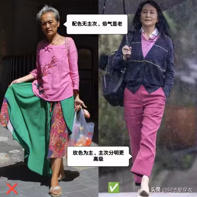 偶爾想穿活潑的玫粉色、天藍色等,就得有主次之分,你們可以用一個亮色+1-2個基礎色中和或用三七分、3:6:1的配色比例搭配,這些配色技巧都值得學。