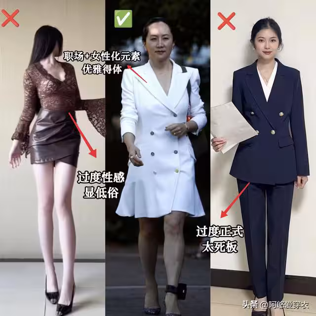 很多人在職場上都容易犯兩個錯誤,要麼穿得太性感暴露,不夠得體;要麼只會西裝革履,太像賣保險的了。但孟晚舟就不一樣了,她很會平衡女人味和職場所需要的幹練沉穩感。