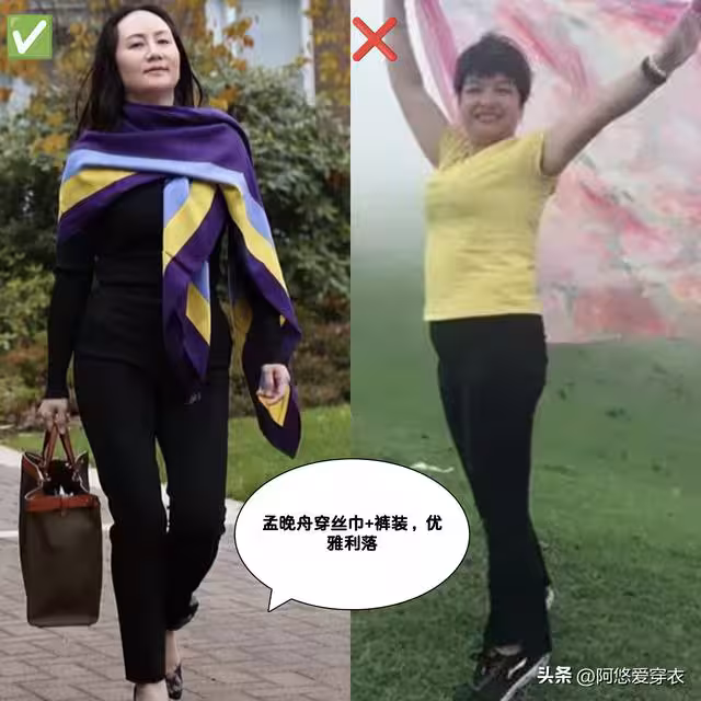 上衣的話,當然是越基礎越不容易出錯,這不,孟晚舟用簡單的黑色打底衫+煙管褲,肩上披一條絲巾就很優雅了。