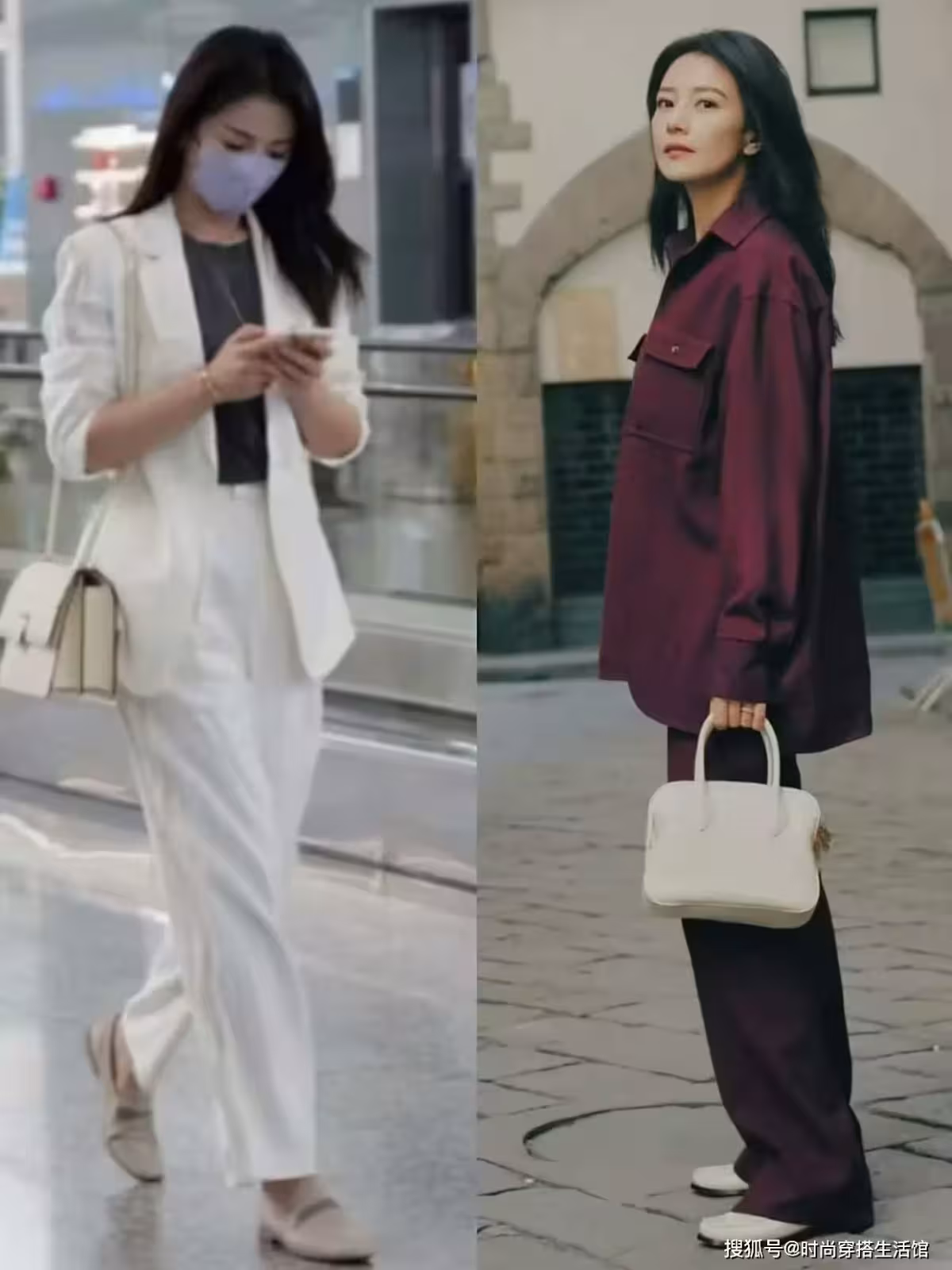 對於中年女性秋天穿闊腿褲非常注重腰線的選擇,畢竟穿同一條闊腿褲但是沒有塑造出高腰線的話就會讓我們的穿搭顯得五五分比例。我們可以看看劉濤、高圓圓的穿搭,她們選擇將上衣塞進闊腿褲,或者是選擇腰帶強調出腰線,瞬間就有效的拉長腿部線條,完全毫不費力就穿出高級感。