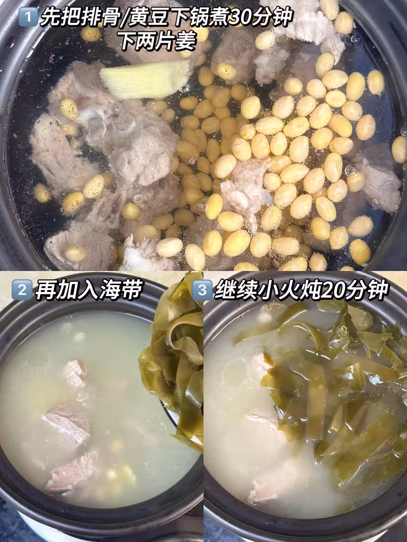 🍀食材:海帶200克,黃豆50克,排骨半斤,姜2片