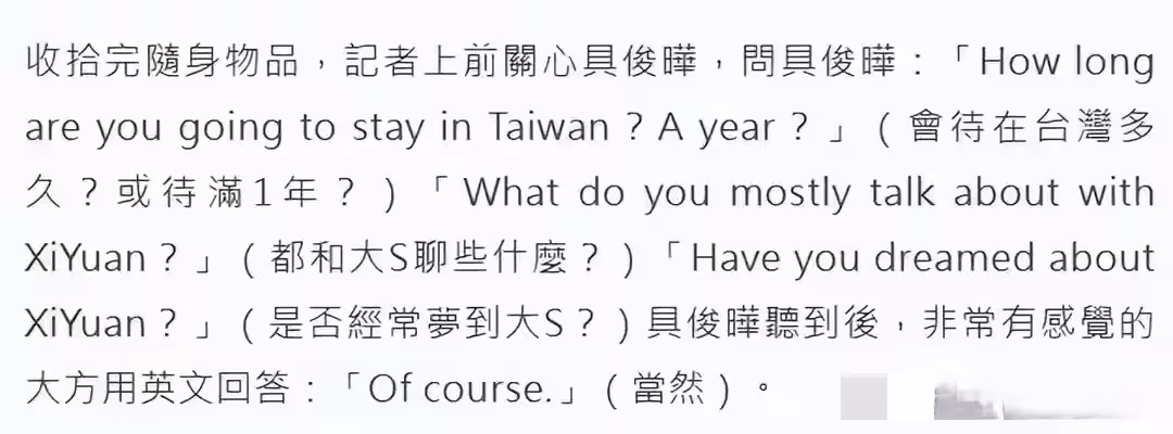 按慣例,具俊曄帶了大S愛吃的美食,鮮花,還有兩個人昔日恩愛照片去墓地。待了幾個小時後,他熟練的收拾摺疊椅準備離開。這時有台媒記者上前關心具俊曄問他近況:會在台灣待多久?來墓地和大S聊什麼?是否經常夢到大S?具俊曄狀態似乎好了些,用英語大方回答:當然會……