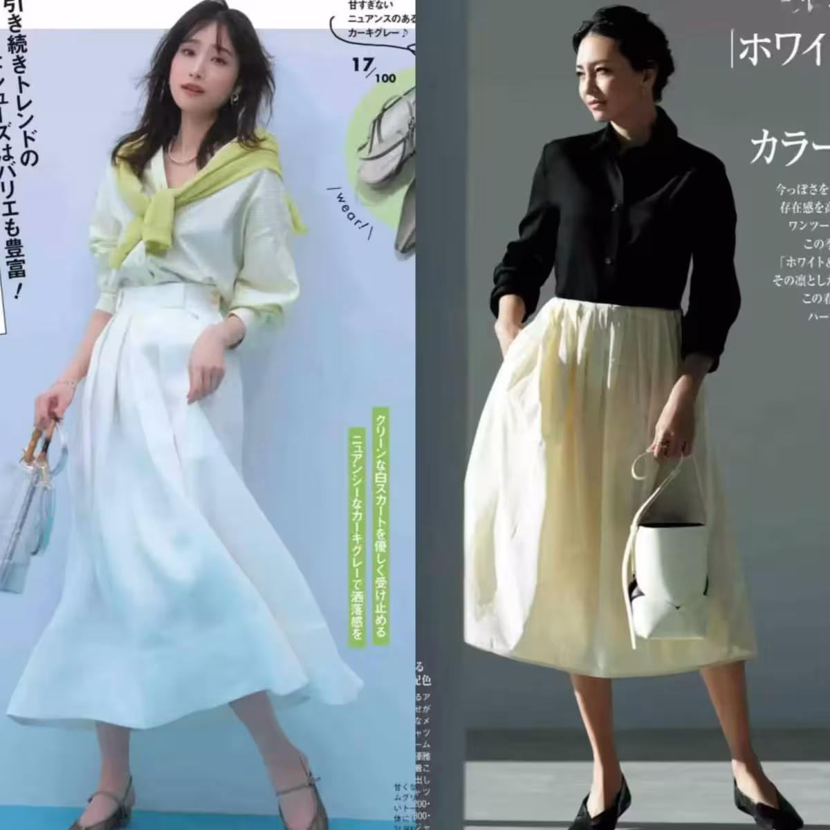 奶油白色的襯衫,搭配了白色的傘裙,裙擺蓬鬆卻不誇張,走起路來如漣漪輕漾,而襯衫則多了一些硬朗帥氣的風格,整體給人一種優雅端莊感,很適合日常通勤。