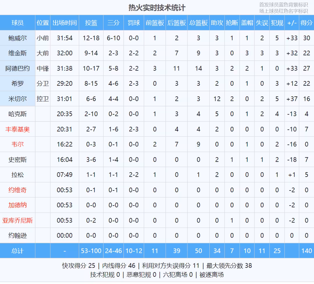 鮑威爾18投12中,0罰球砍下30分3籃板3助攻。阿德巴約27分14板3助2斷2帽、維金斯22分9板3助3帽、希羅22分3板2助。最後看看數據: