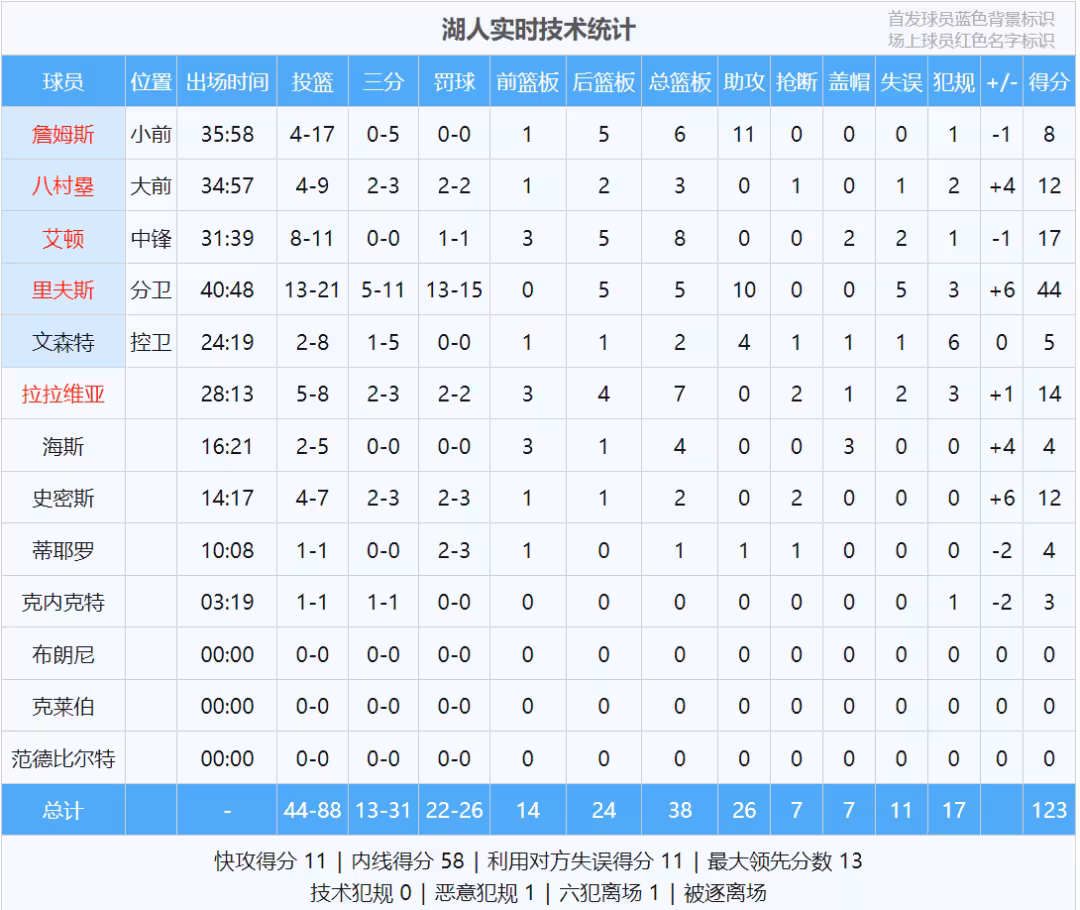時間12月5日,NBA常規賽:湖人123-120險勝猛龍。東契奇第二個孩子出生,今天沒有出戰。里夫斯投籃21中13,三分11中5,罰球15中13,狂砍44分5板10助5失誤,正負值+6。比賽最後時刻,詹姆斯助攻八村塁三分絕殺。
