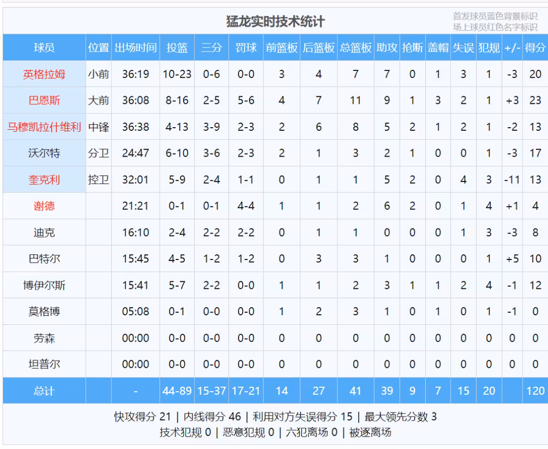 詹姆斯此役手感不佳:17投4中,三分球5中0,得到8分5籃板11助攻0失誤,正負值-1。詹姆斯連續1297場得分上雙的紀錄,今天正式被終結。上一次詹姆斯在常規賽得分個位數,還要追溯到2007年1月5日,距今已經將近19年。